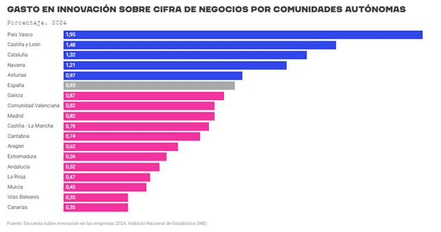 Las empresas vascas son las que presentan una mayor intensidad innovadora, un 1,95%, seguidas de las de Castilla y León (1,48%), Cataluña (1,32%), Navarra (1,21%) y Asturias (0,97%). Estas regiones son las únicas que se sitúan por encima de la mencionada media nacional en intensidad innovadora (0,93%).