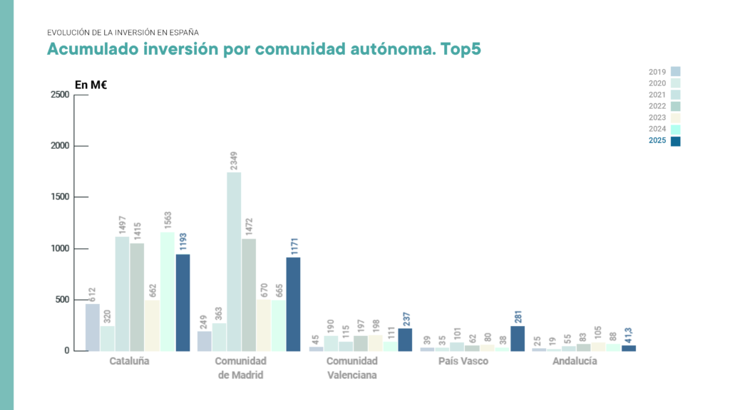 La Comunidad de Madrid registra, por su parte, 1.171,3 M€ en casi 80 operaciones. La inversión mejora significativamente a la de 2024 (665,9M€), creciendo un 75% y manteniendo el número de rondas. Se trata de la mejor cifra para la comunidad desde 2022 y la tercera de su historia desde que El Referente contabiliza las operaciones de inversión.