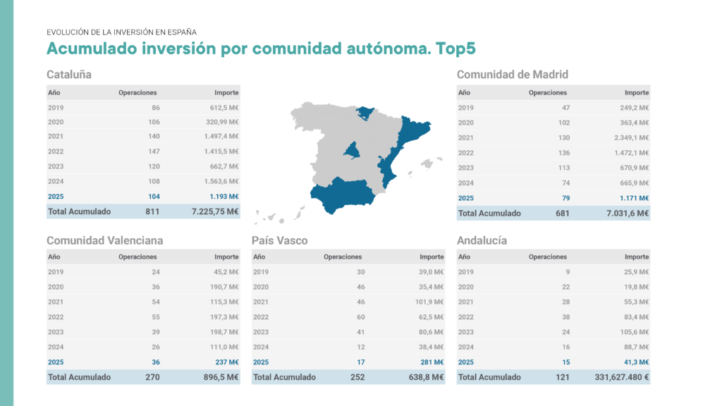 La Comunidad Valenciana también firma su mejor año del periodo, con 237 M€ en 36 operaciones, representando el 26% de su acumulado histórico. A diferencia de otros años, no solo crece el capital, sino que se sostiene un volumen de actividad elevado. Supera también el máximo anterior (2023: 198,7 M€) en más de 38 M€, creciendo un 19% y multiplica por dos las cifras de 2024.
