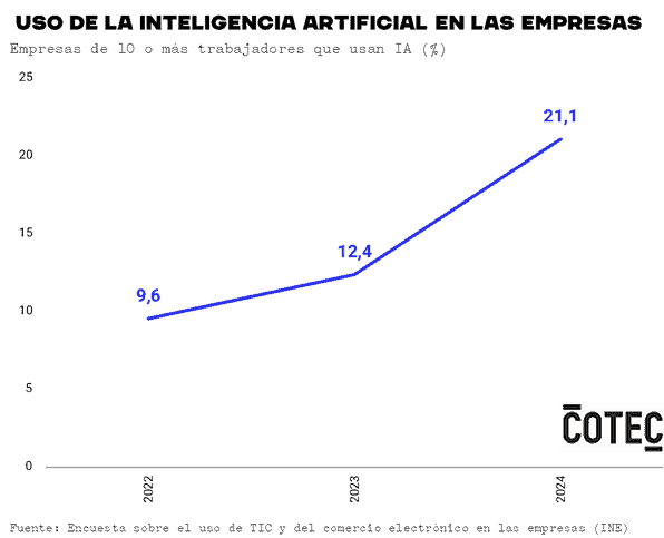 El 21,1% de las empresas españolas de 10 o más trabajadores ya había adoptado en 2024 alguna tecnología relacionada con la inteligencia artificial en sus procesos productivos, 8,7 puntos porcentuales más que en el año anterior y 11,5 más que en 2022, el primer año de la serie histórica. Se trata de un fenómeno desigual si atienden diversos factores, como la ubicación de la empresa, su tamaño o el sector al que pertenece. Son datos publicados este miércoles por el Instituto Nacional de Estadística (INE) y que analiza la Fundación Cotec en su estudio Uso de la IA en las empresas, ya disponible en cotec.es.