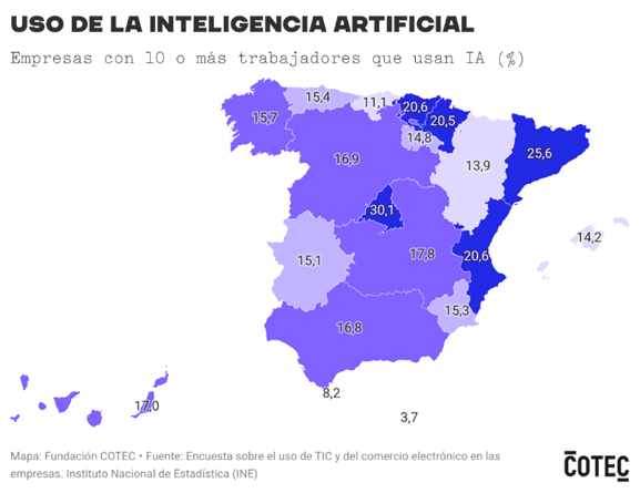 La difusión de la inteligencia artificial en las empresas varía de forma significativa entre comunidades autónomas. La Comunidad de Madrid encabeza el ranking, con un 30,1% de empresas usuarias entre aquellas que tienen al menos 10 trabajadores, seguida de Cataluña (25,6%).