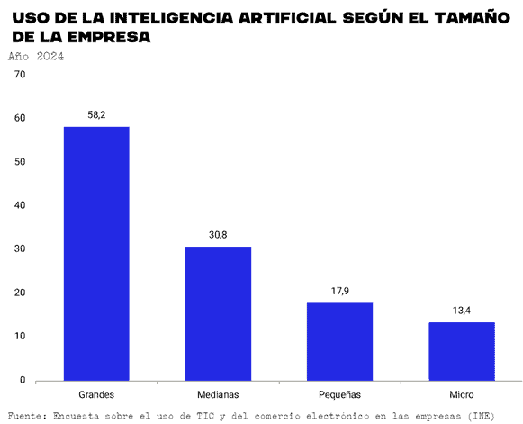 Los datos del INE confirman que existe una mayor propensión a usar la inteligencia artificial en las empresas a medida que aumenta su tamaño. De esta manera, existe una brecha de hasta 44,9 puntos porcentuales entre las que más la usan las grandes (con un 58'2%) y las que menos lo hacen las microempresas (con un 13'4%).