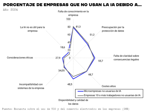 Existen, de nuevo, algunos matices cuando analizamos las razones de las empresas de distinto tamaño no usuarias de la IA. En este sentido, las microempresas no usuarias de la IA destacan por apuntar a la disponibilidad y calidad de los datos (54,1%) y a las consideraciones éticas (28,0%), mientras que entre las empresas de 10 o más trabajadores cobran más peso factores como la preocupación por la protección de los datos (53,6%) y la incompatibilidad con los sistemas internos de la empresa (34,1%).